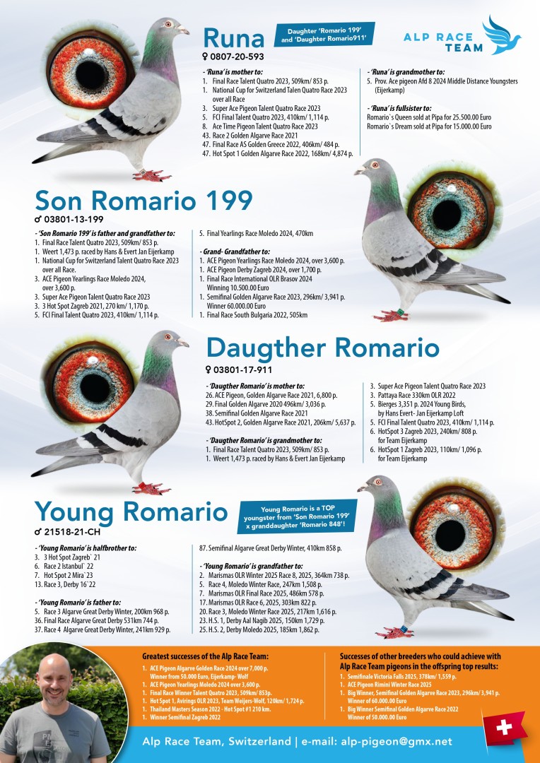 Alp赛鸽团队的主要种鸽是“罗马里奥直子199”(DV03801 - 13 - 199),它可以被认为是世界上”罗马里奥“最佳子代之一!“罗马里奥199”的三代子代赢得了众多奖项,赛绩如下: