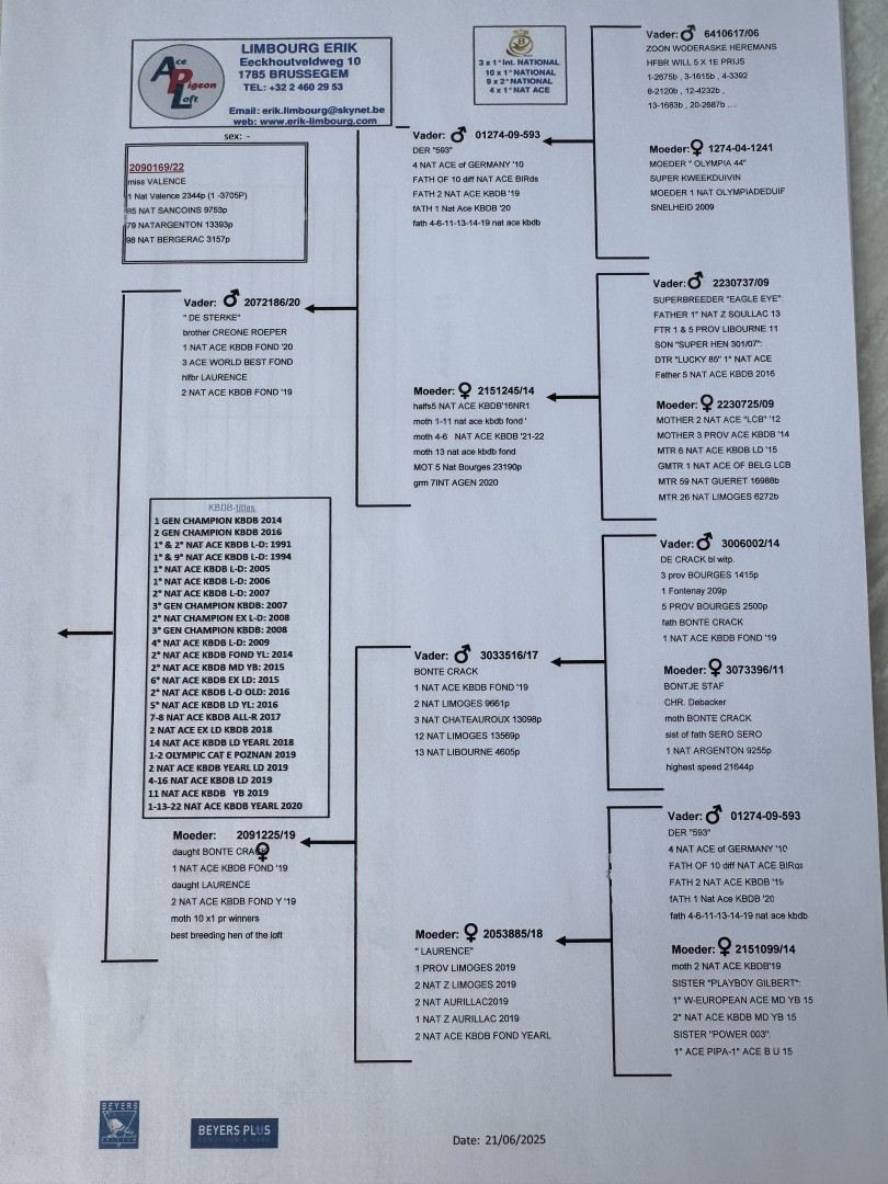 National Valence Belgium 2025 category Old birds is won by Erik Limbourg (Brussegem). The winner arrived Saturday at 15:51 CEST after flying 672,10 km, achieving an average velocity of 1197,04 m/min, being the fastest one of 2,344 Old birds and fastest of the total release of 3,705 pigeons. Congratulations!